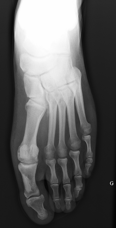 Mr.S., 32 ans, consulte aux urgences pour douleurs du pied gauche en inversion forcée. A l’examen on note une douleur de la base du 5ème métatarsien à la palpation et à l’éversion contrariée. La malléole latérale est indolore. Il n’existe pas de douleur à la mobilisation de la transverse du tarse. La marche est difficile. Devant ces signes cliniques, vous demandez un bilan radiographique. Vous êtes attiré par une image radiologique qui semble sans rapport avec ce traumatisme. Voici une partie des images que vous obtenez:
